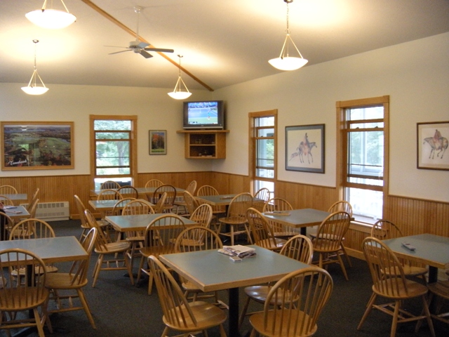 rock fireplace is set up to accommodate golfers looking for a meal, drink or a